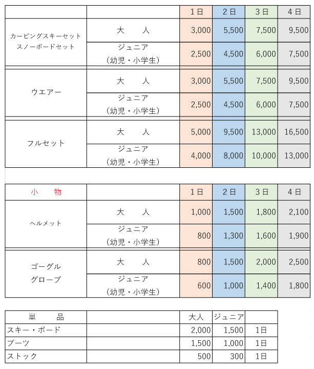 また、帽子やゴーグル、パスケース等の小物は、レンタルと販売、お好きな方法でご利用いただけます。